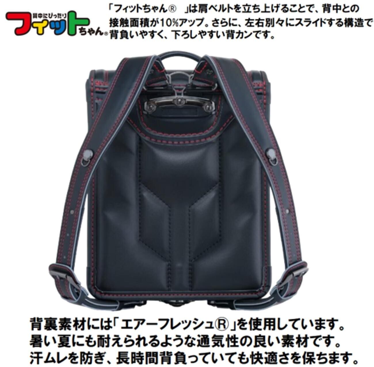 さらに、「フィットちゃんR」は肩ベルトを立ち上げることで、背中との接触面積が10%アップ。さらに、左右別々にスライドする構造で背負いやすく、下ろしやすい背カンです。