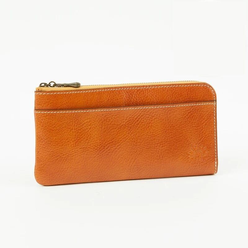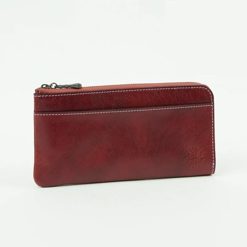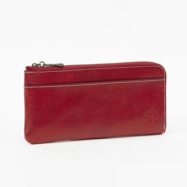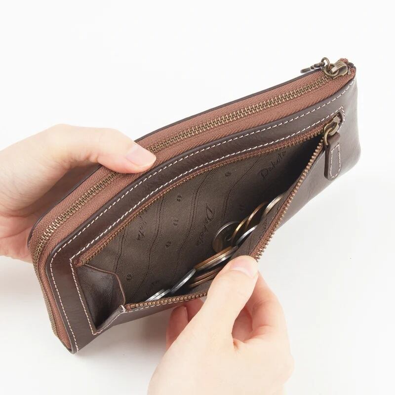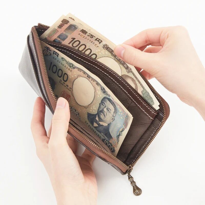 薄マチタイプのスマートなL字ファスナー長財布。レシートなどが収納できる前面オープンポケット、硬貨や鍵など小物の収納にも便利な背面ファスナーポケット付き。中には、お札入れスペースが2つ、ファスナーレス小銭入れ、カードポケットが16個備わっています。