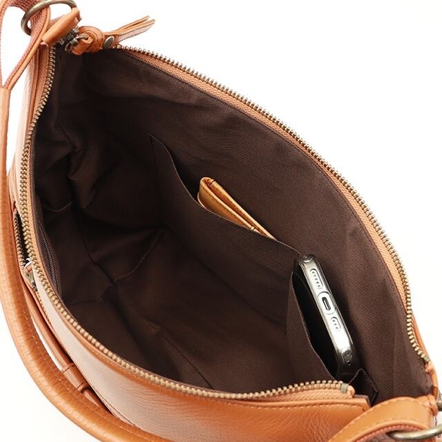 タック使いと箔押しのロゴでフェミニンな雰囲気に仕立てました。ポケットを多く配し、日常使いのしやすいデザインです。また、色焼けしづらく、傷もつきにくい牛革を使用しているので、オンオフ問わず幅広いシーンでお使いいただけます。