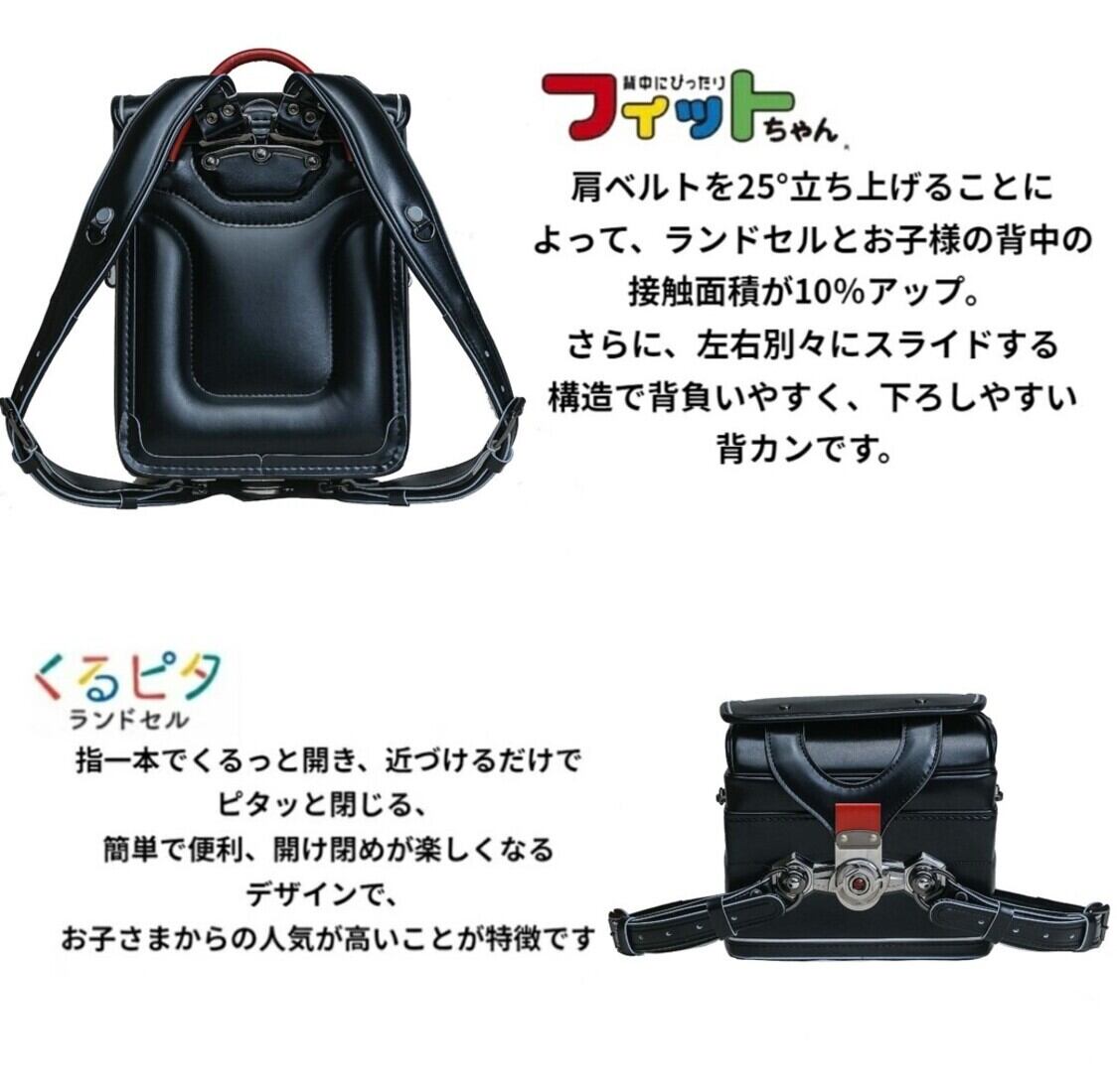 くるピタ楽ピタフィットちゃんは、その名の通り、被るだけでフィットするランドセルです。午前中に頑張った姿勢を保てるよう、背面パッドも厚めにつくられています。背負い心地はもちろん、耐久性にもこだわりました。毎日、雨風に打たれ、授業で背負われるため、大切なお子様の健康を守るために。